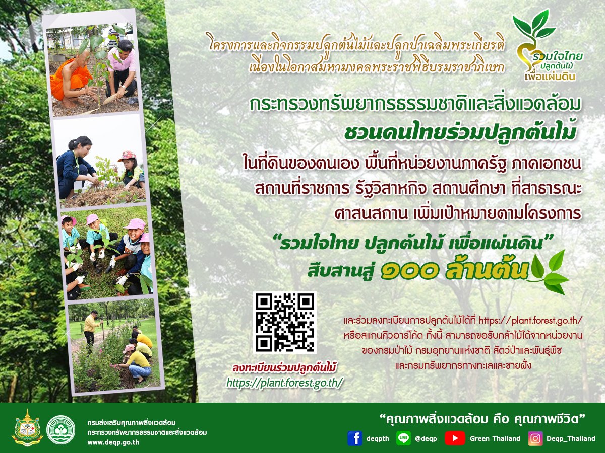 ประชาสัมพันธ์เชิญชวน โครงการและกิจกรรมปลูกต้นไม้และปลูกป่าเฉลิมพระเกียรติ เนื่องในโอกาสมหามงคลพระราชพิธีบรมราชาภิเษก "รวมใจไทย ปลูกต้นไม้ เพื่อแผ่นดิน สืบสานสู่ ๑๐๐ ล้านต้น"