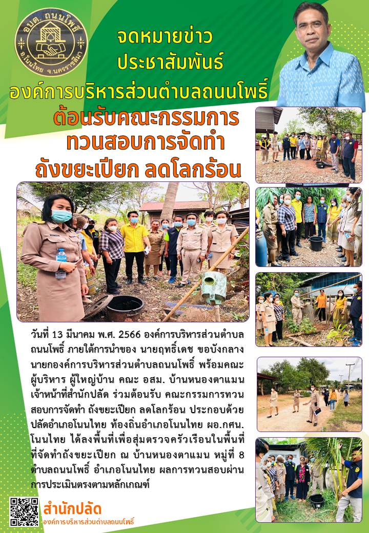 วันที่ 13 มีนาคม พ.ศ. 2566 องค์การบริหารส่วนตำบลถนนโพธิ์ ภายใต้การนำของ นายฤทธิ์เดช ขอบังกลาง นายกองค์การบริหารส่วนตำบลถนนโพธิ์ พร้อมคณะผู้บริหาร ผู้ใหญ่บ้าน คณะ อสม. บ้านหนองตาแมน เจ้าหน้าที่สำนักปลัด ร่วมต้อนรับ คณะกรรมการทวนสอบการจัดทำ ถังขยะเปียก ลดโลกร้อน ประกอบด้วย ปลัดอำเภอโนนไทย ท้องถิ่นอำเภอโนนไทย ผอ.กศน.โนนไทย ได้ลงพื้นที่เพื่อสุ่มตรวจครัวเรือนในพื้นที่ ที่จัดทำถังขยะเปียก ณ บ้านหนองตาแมน หมู่ที่ 8 ตำบลถนนโพธิ์ อำเภอโนนไทย ผลการทวนสอบผ่านการประเมินตรงตามหลักเกณฑ์