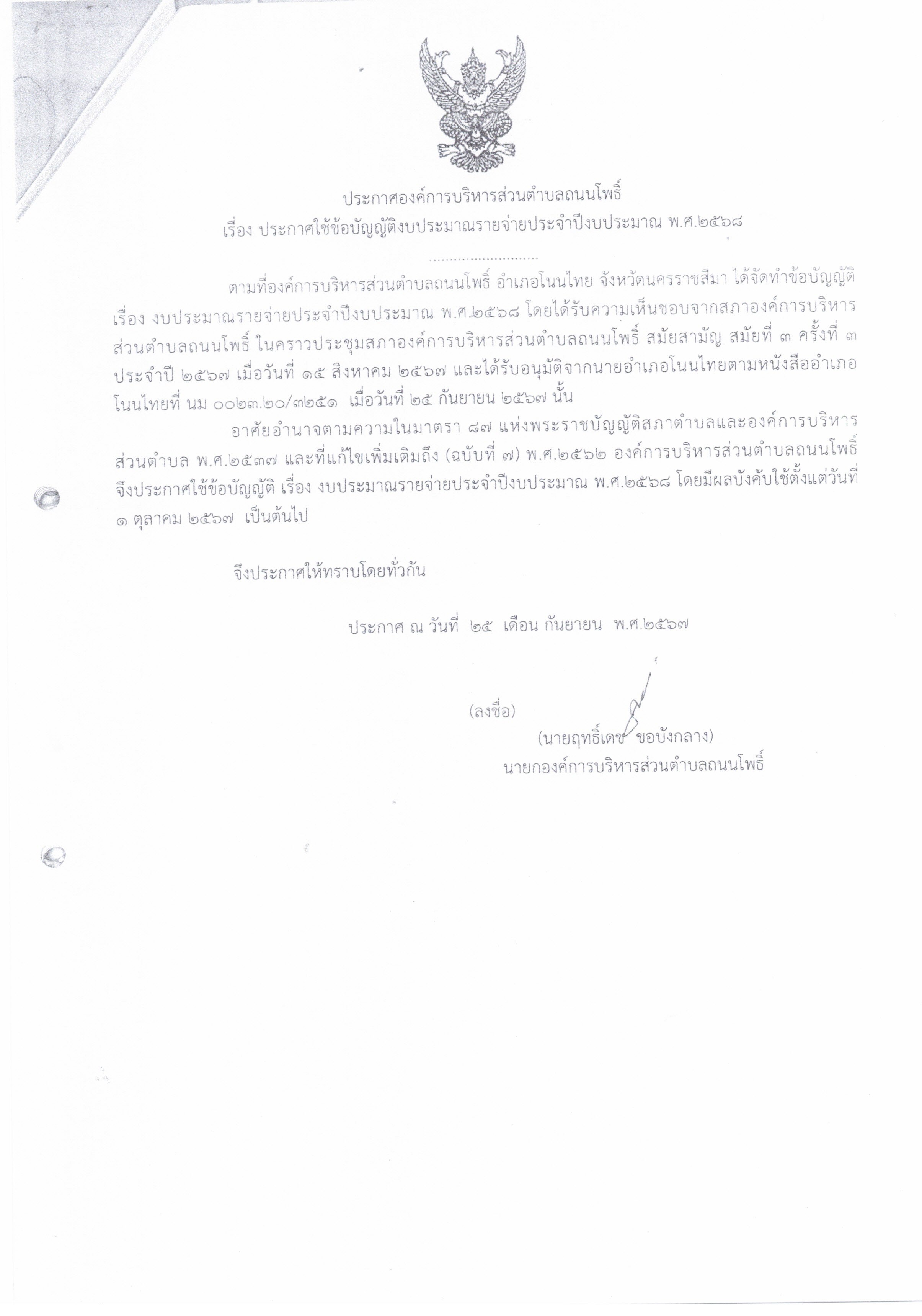 ประกาศใช้ข้อบัญญัติงบประมาณรายจ่าย พ.ศ.2568